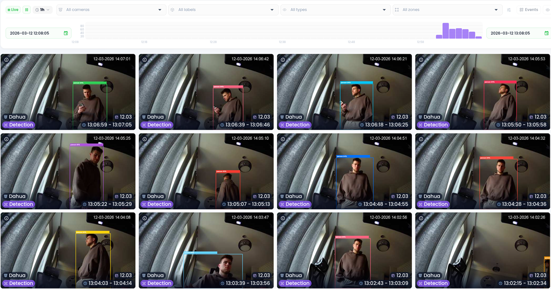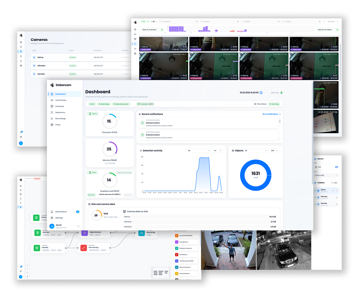 Alongside advanced AI analysis, the platform provides everything needed to operate a modern surveillance system: live camera preview, recording and playback, camera management, a centralized dashboard with system and detection metrics, and an event browser with a visual timeline for reviewing incidents.