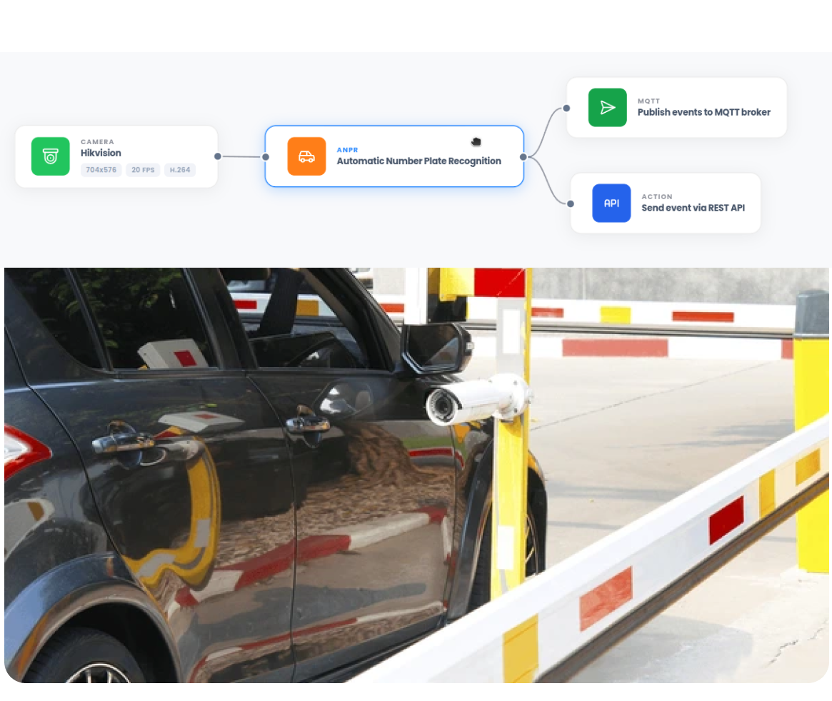 Detected events - including people, vehicles, or license plates - can trigger automated responses across connected systems, enabling actions such as lighting control, gate access, alert notifications, or execution of custom automation workflows in real time.